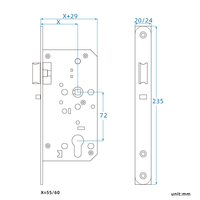 55/60mm(Backset); 72mm(Center distance) |