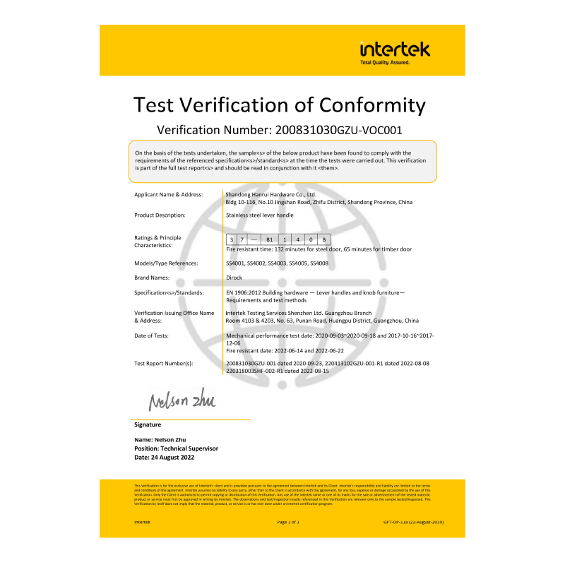 Key FeaturesCertified Reliability: Tested for durability, corrosion resistance, and fire resistant door compatibility by Intertek , this lever handle is compliant with EN 1906, DIN 18273, DIN 18255 and EN 1634-1 requirements for mechanical and fire performance, ensuring reliability in high-frequency of use by public.